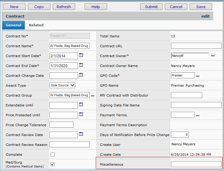 The new Miscellaneous field on the contract header is for optional, site-specific data that you wish to include with the contract. For example, you may wish to enter codes or names for other areas at your site that can use the contract. Miscellaneous is a sixty-character alphanumeric field. Figure 6 displays the field location.