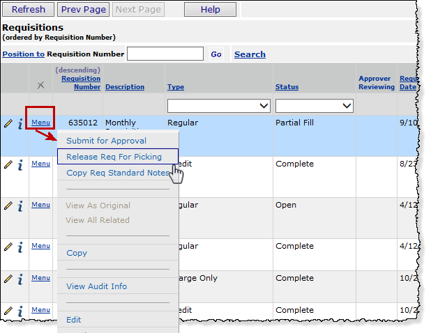 Panel Changes: Requisitions list - The redundant link "Release Req for Picking" is removed, and is now on the line Menu only.