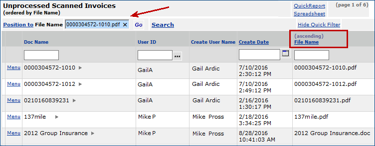 On the Unprocessed Scanned Invoices panel, click the File Name column header (Figure 5) to sort the list in ascending order. Click again to sort in descending order. The Position To also can accept a File Name value for positioning the list to a particular invoice.